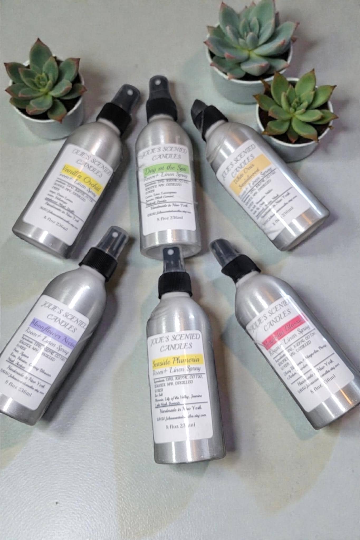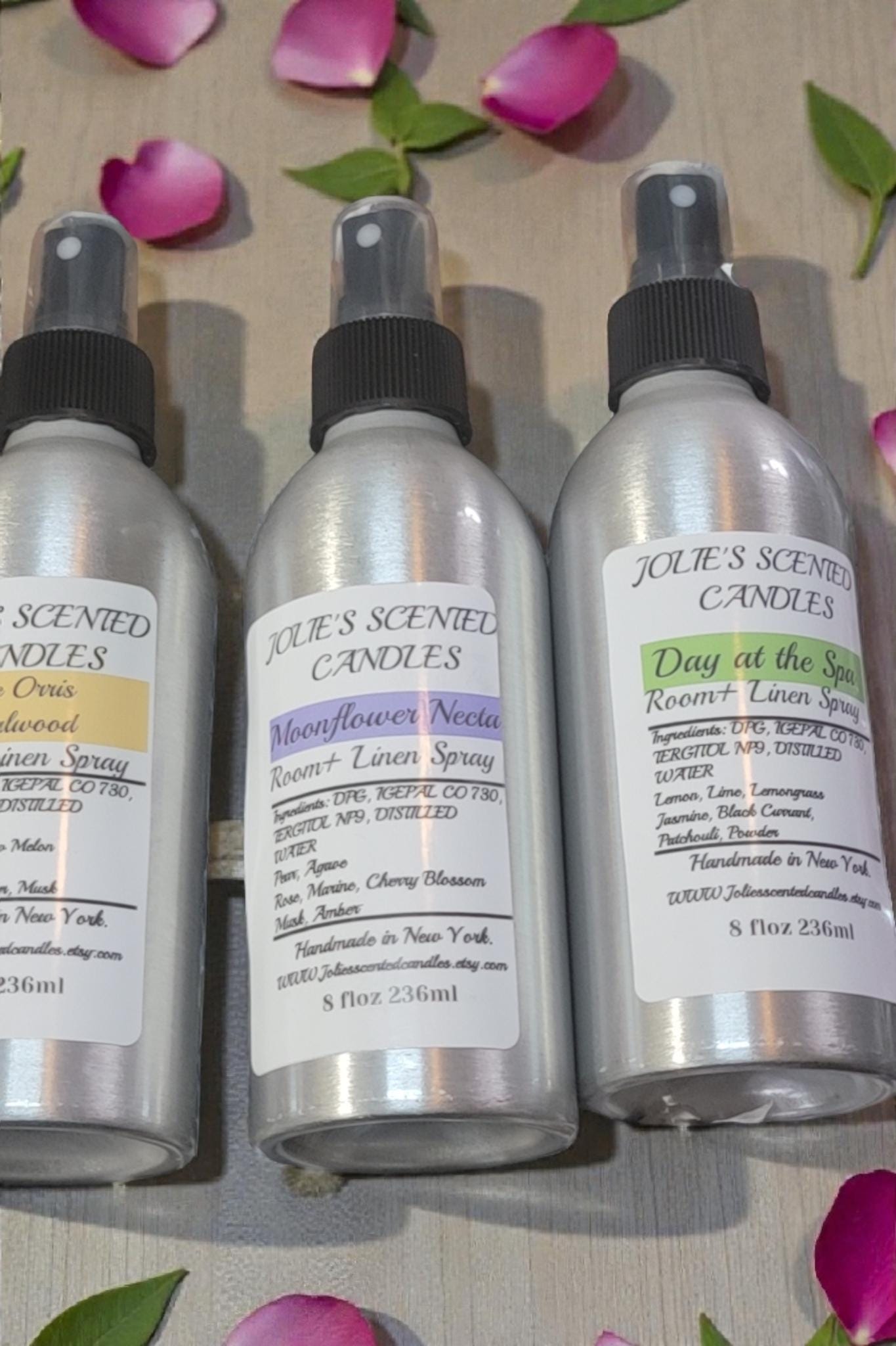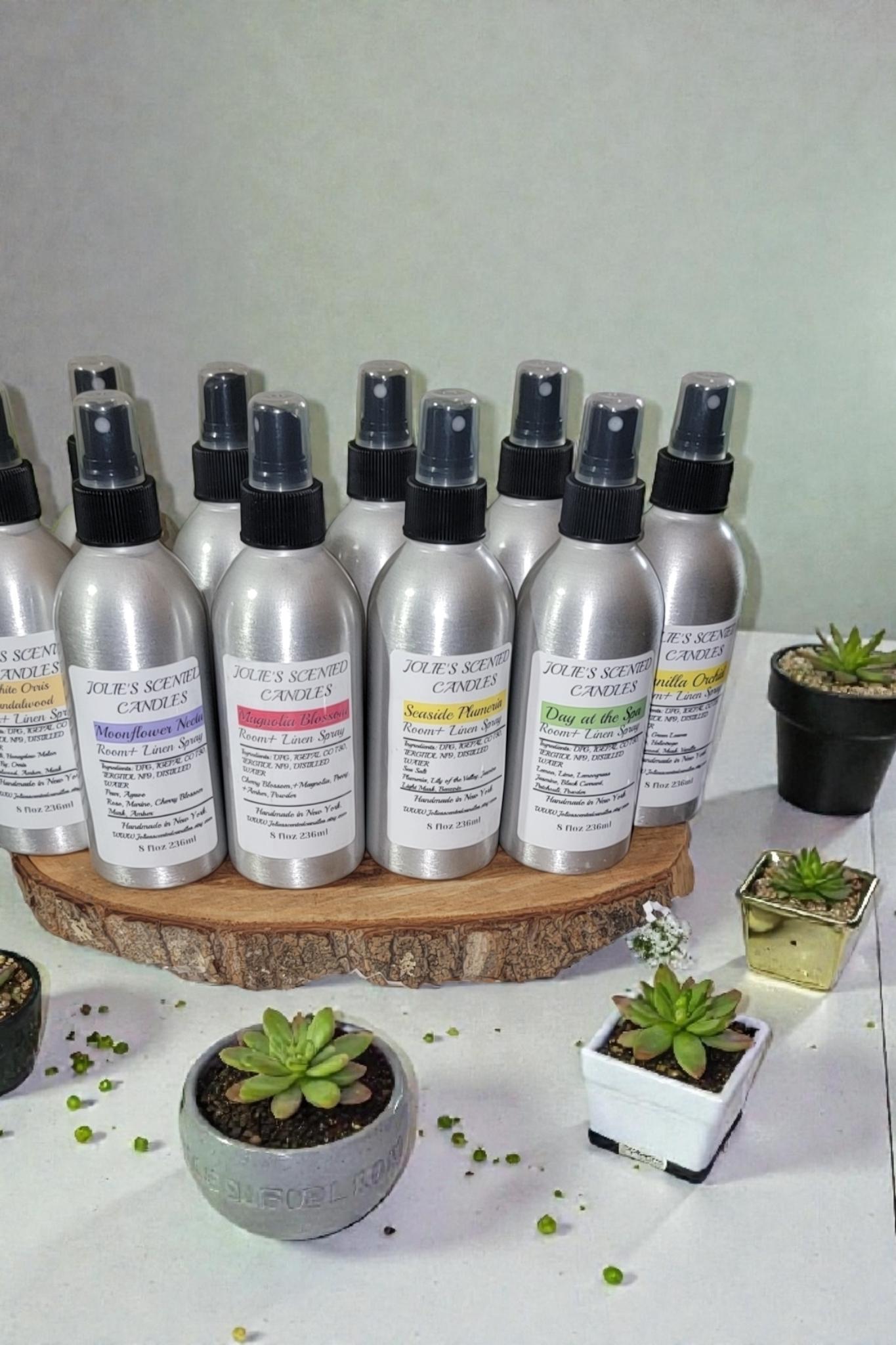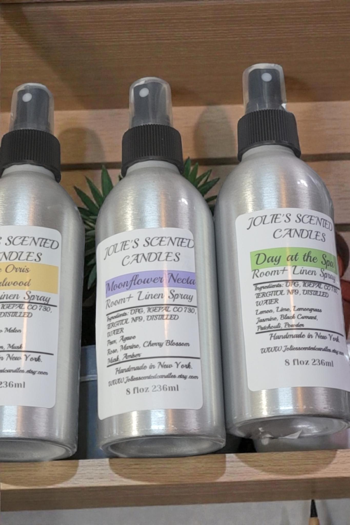 Room and linen spray come in an 8 oz Aluminum. jar with a spray top