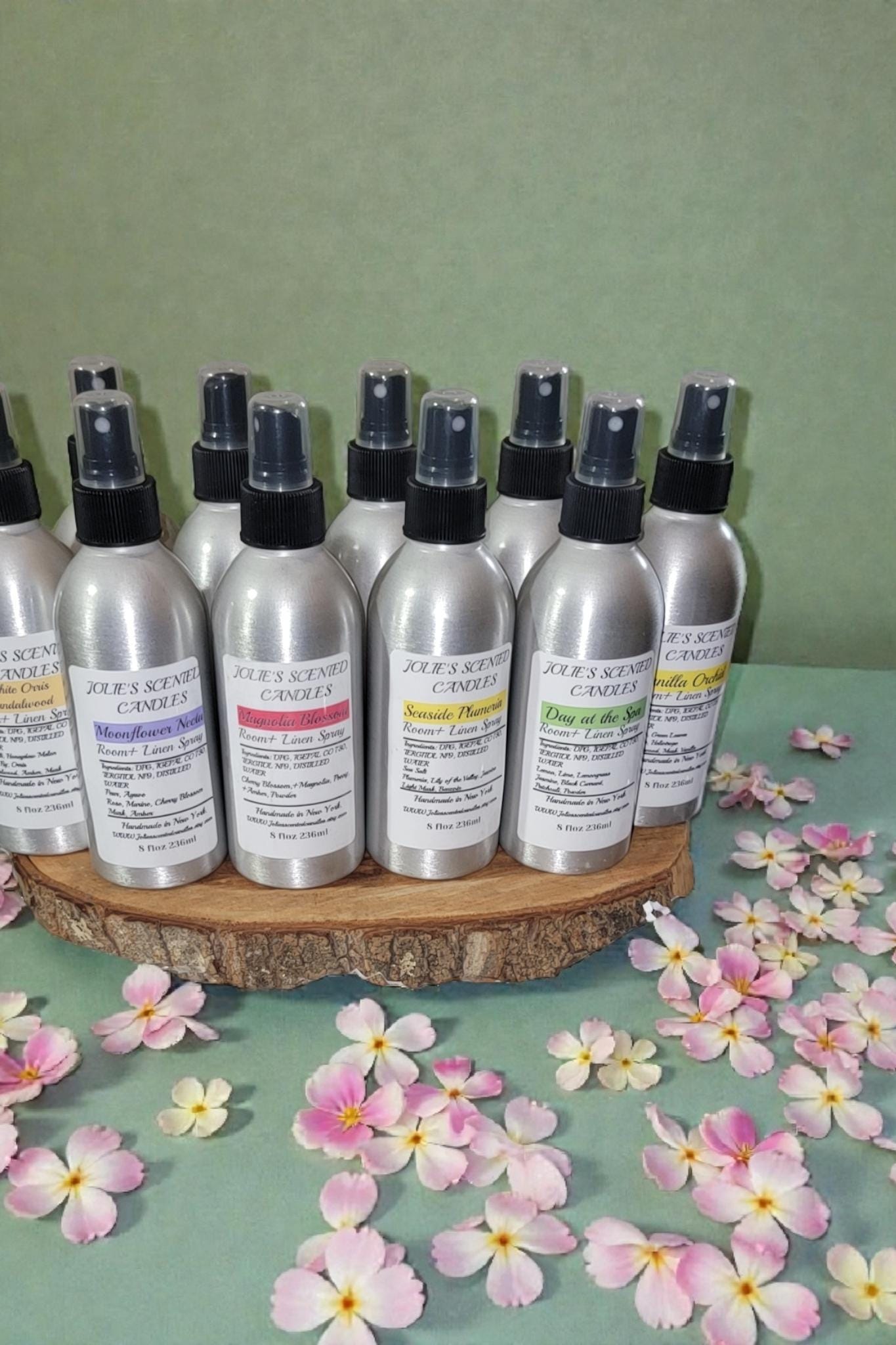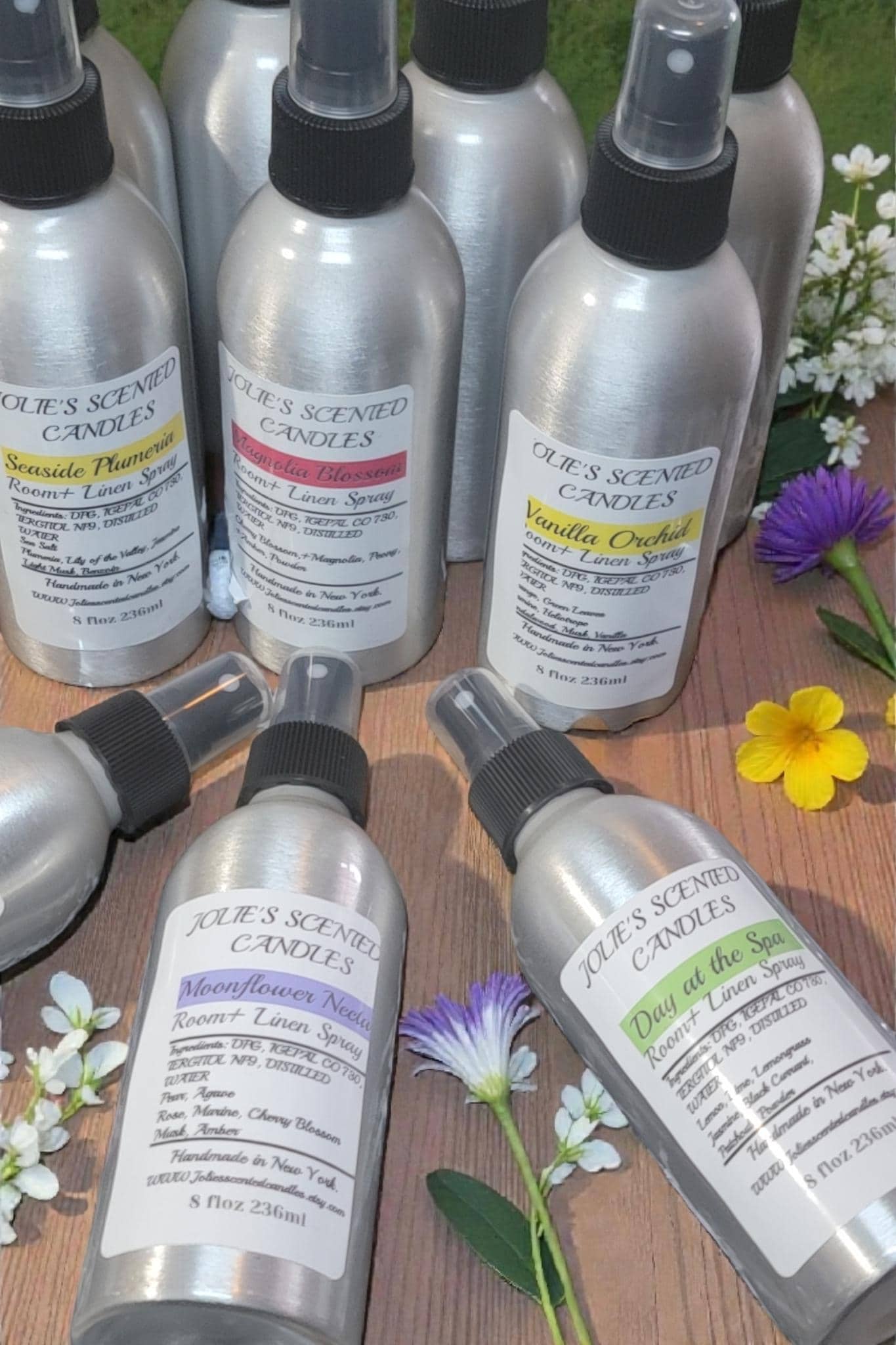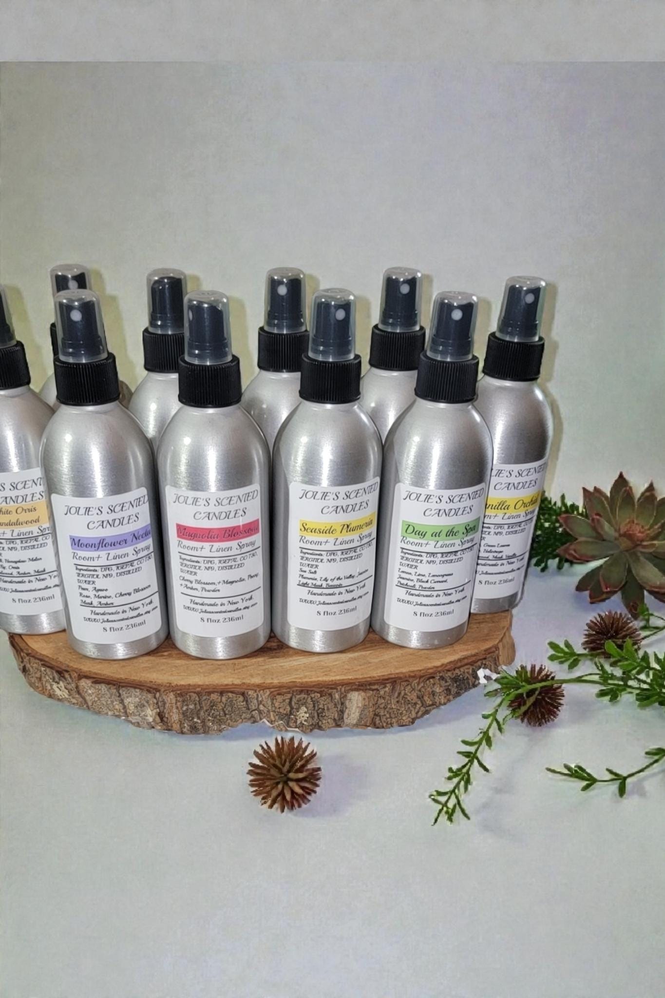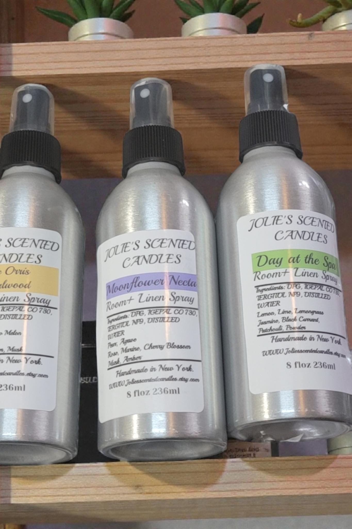 Room and linen spray come in an 8 oz Aluminum. jar with a spray top