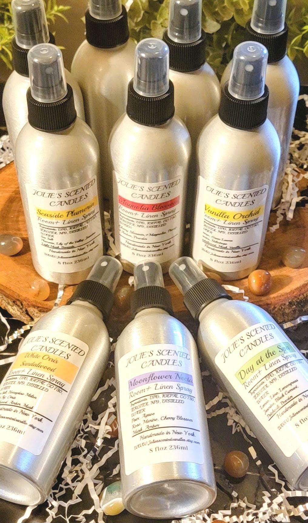 Our scented room and linen sprays come in all of our scents and are safe for your home and environment! While these sprays are skin-safe, we suggest testing a small area first. We also advise testing a small area of fabric before spraying and spraying from 12" away. We do not use emulsifiers in our product, so make sure to always shake well before each use to mix the product up for the best results!