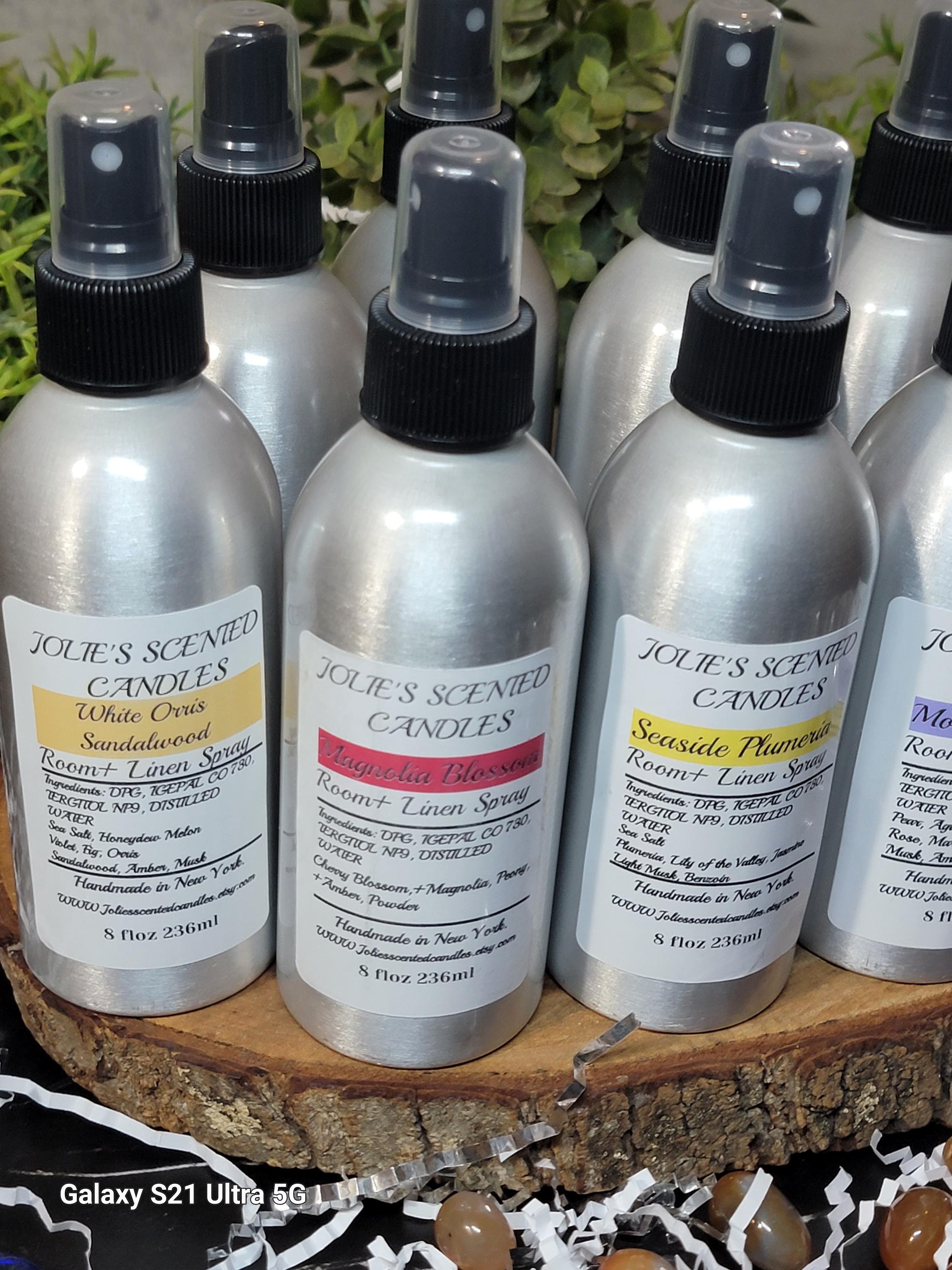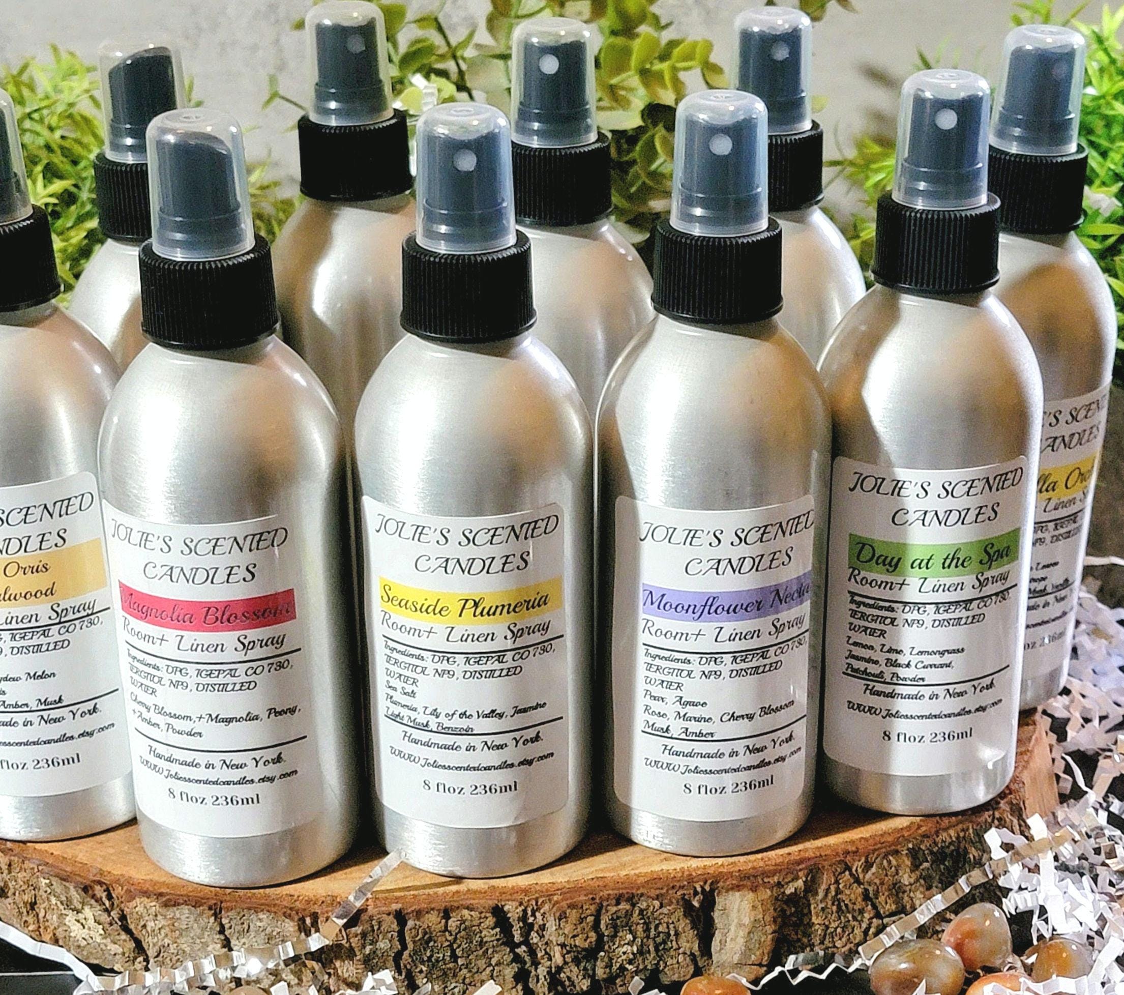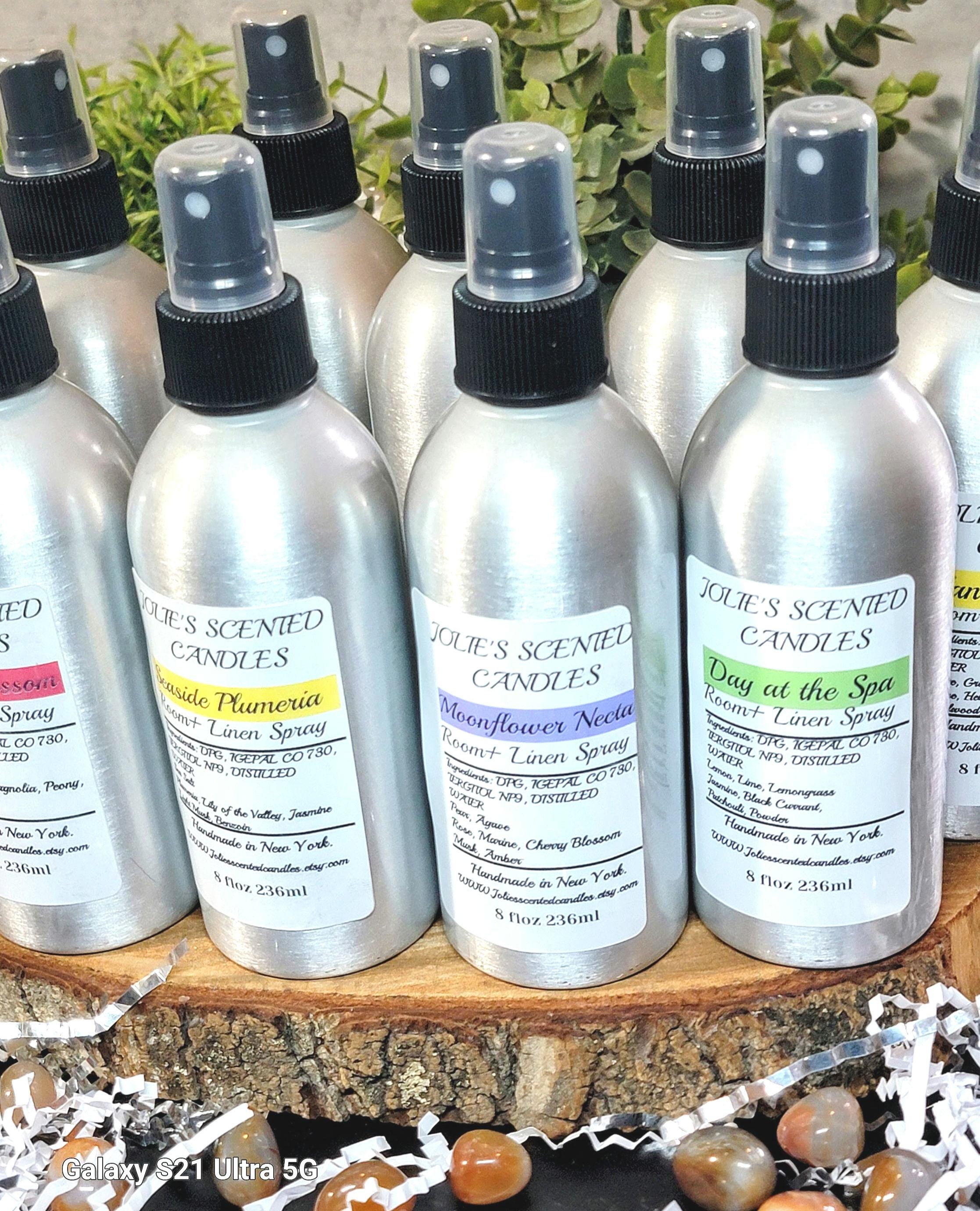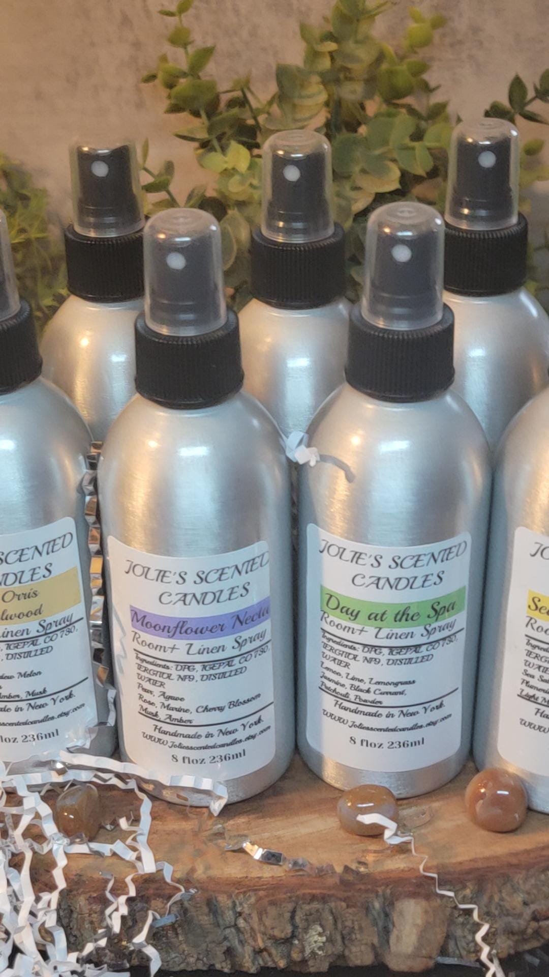 Room and linen spray come in an 8 oz Aluminum. jar with a spray top