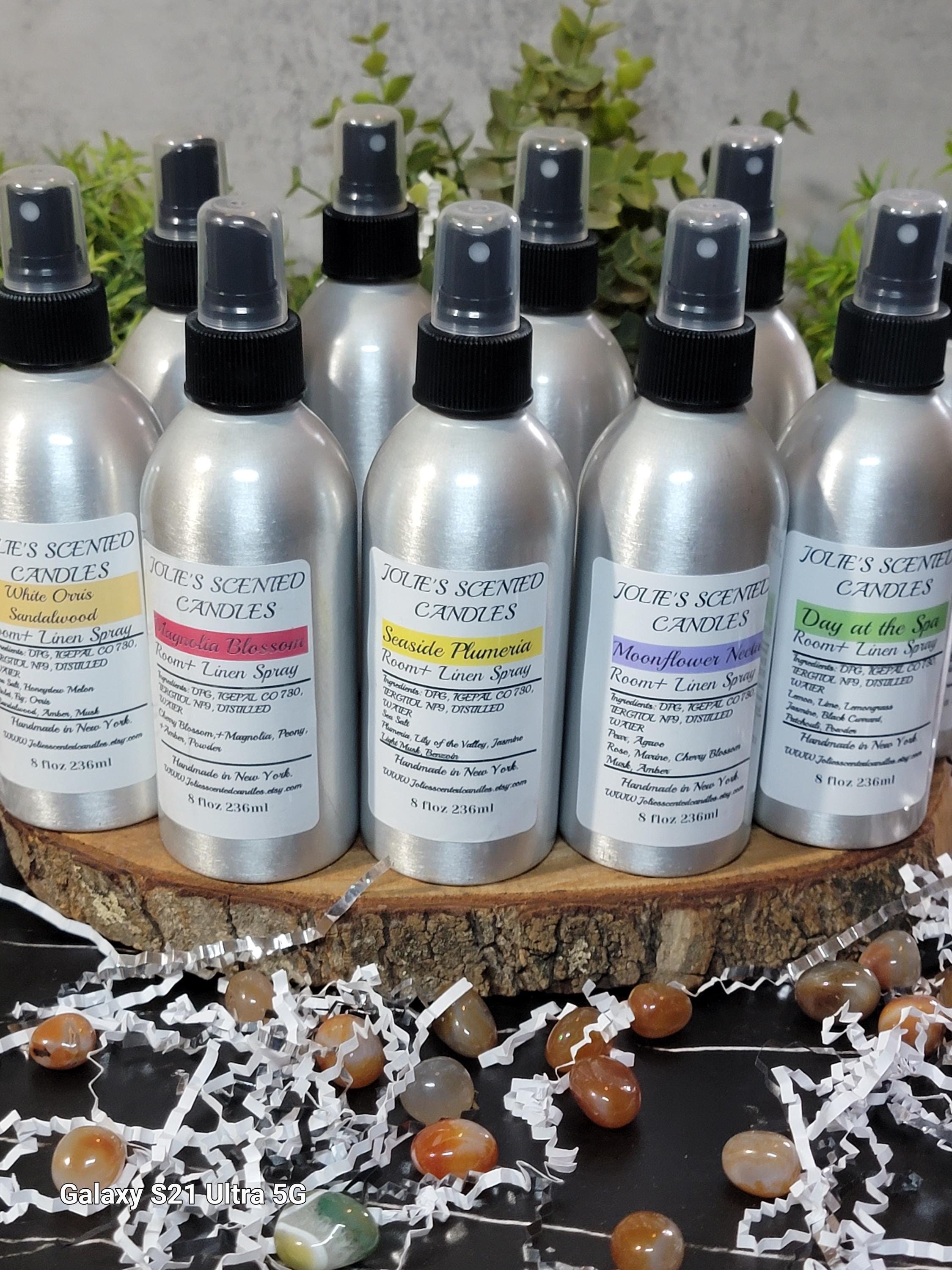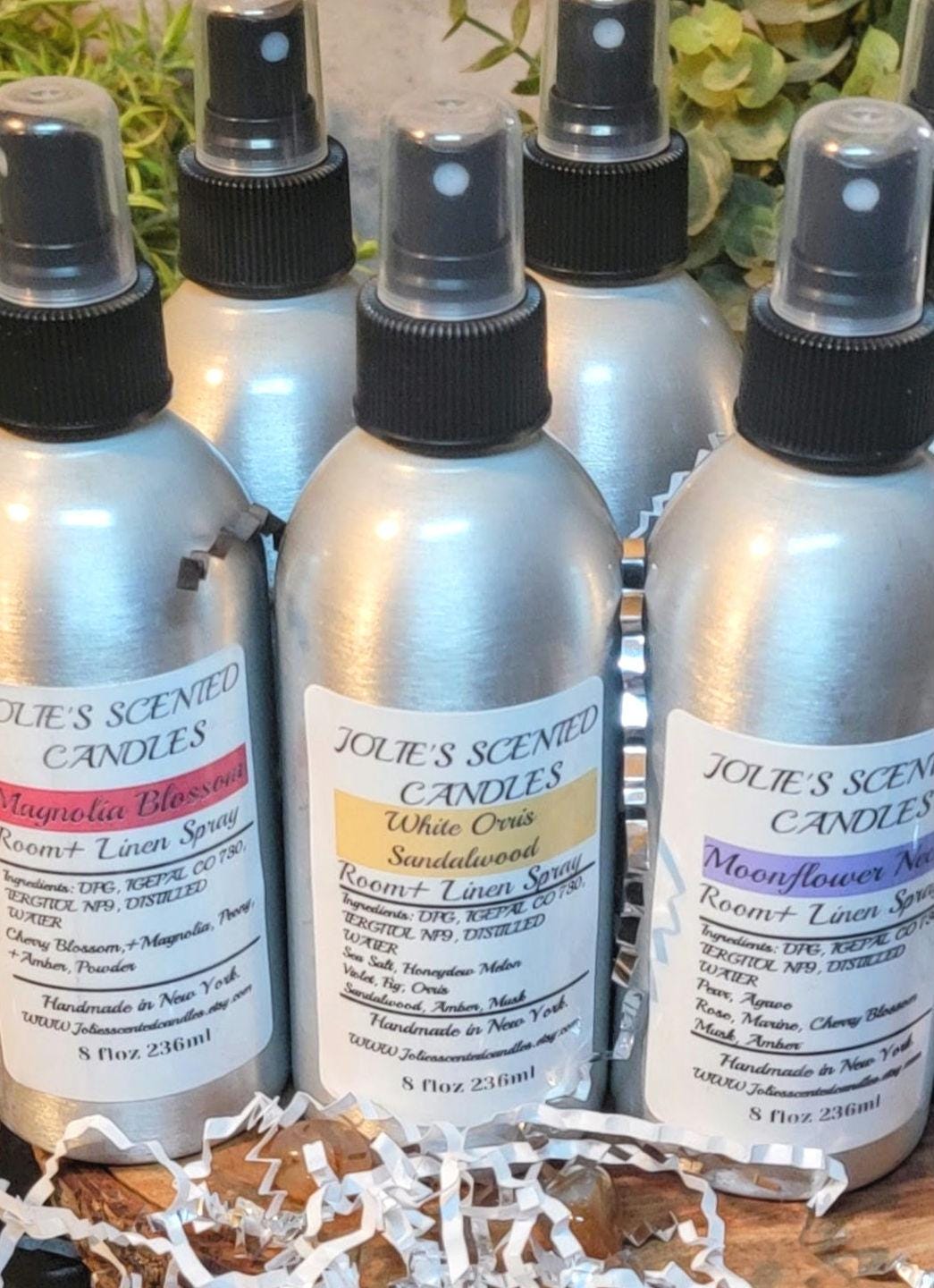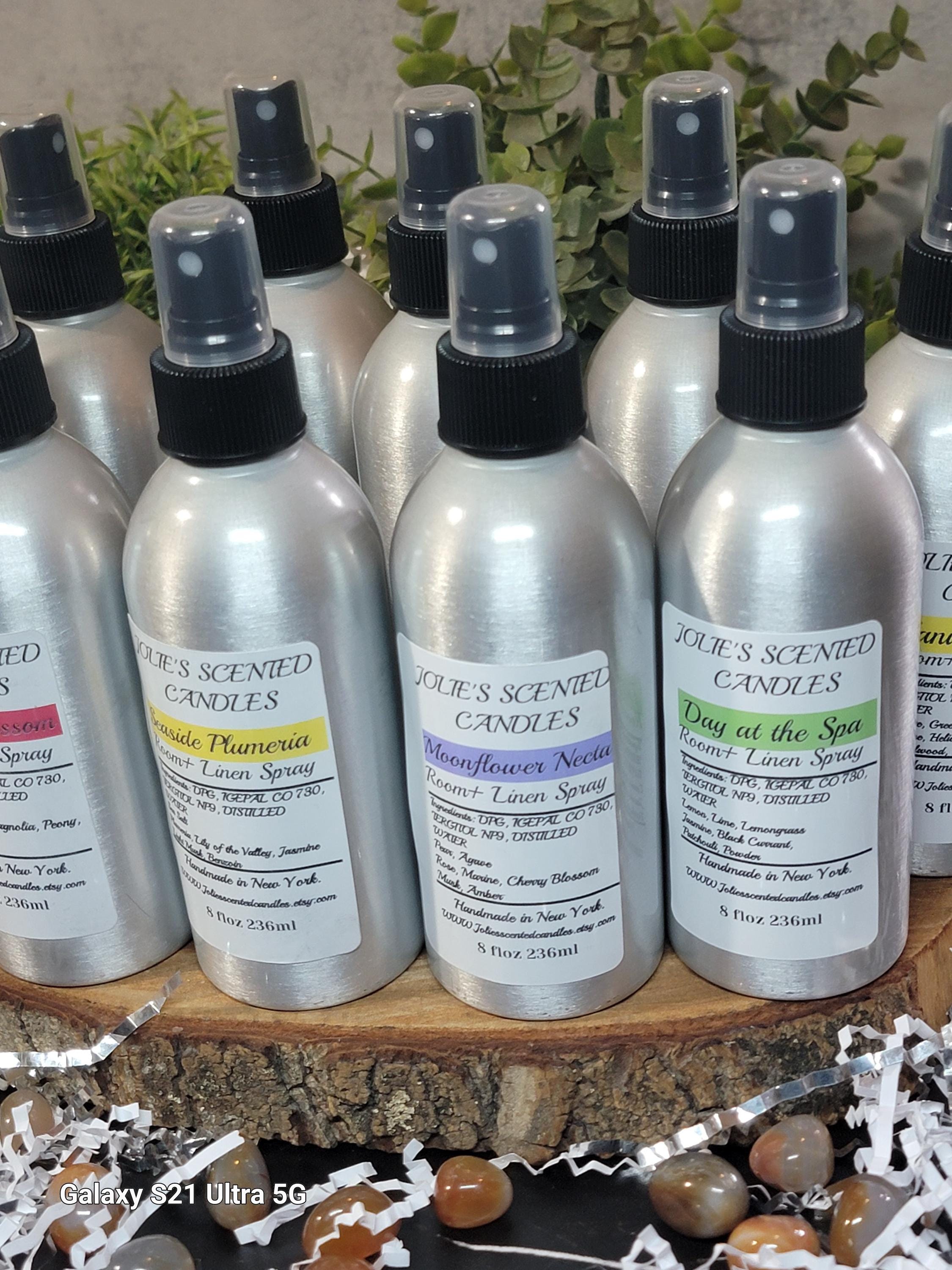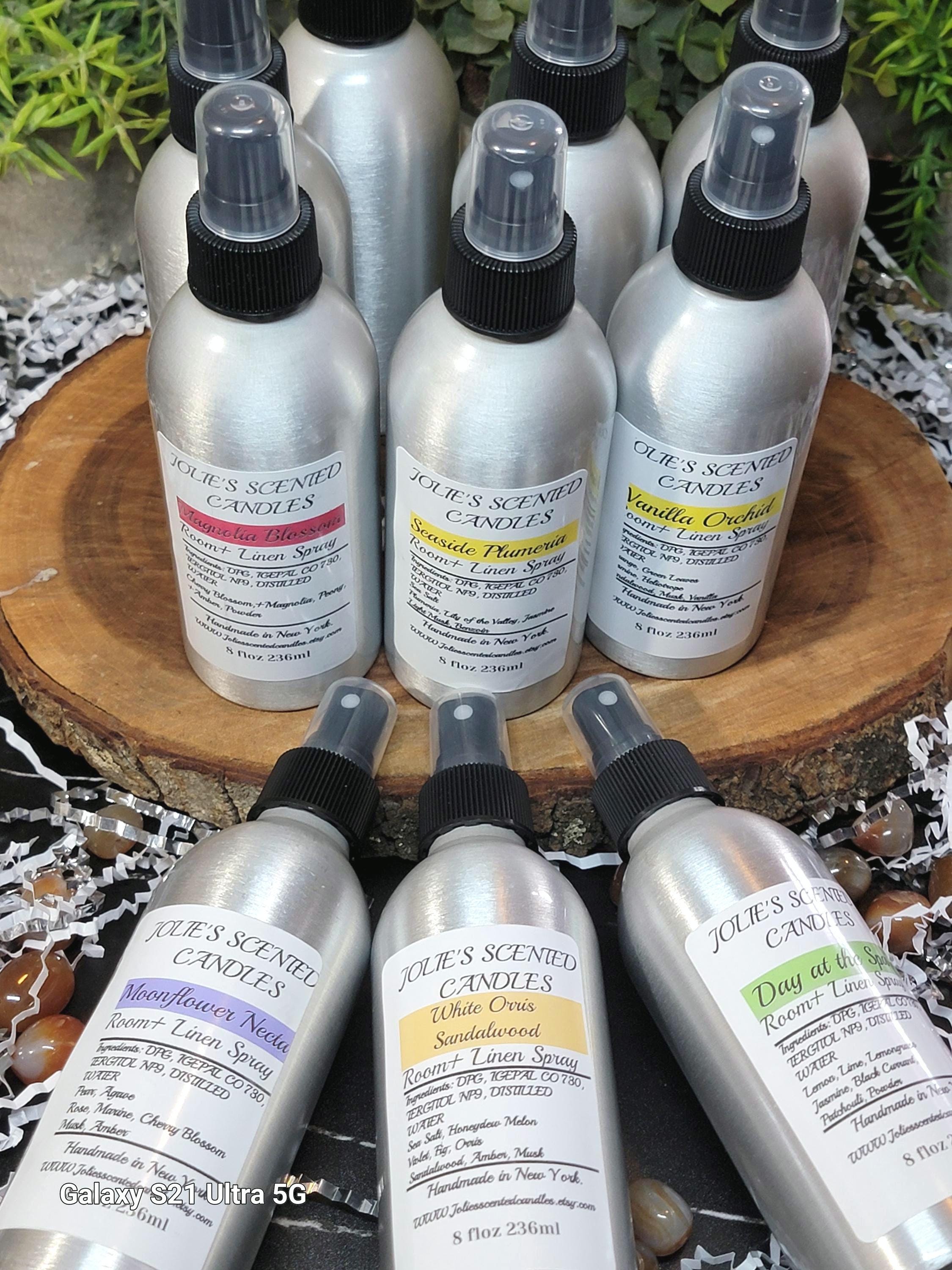 Room and linen spray come in an 8 oz Aluminum. jar with a spray top