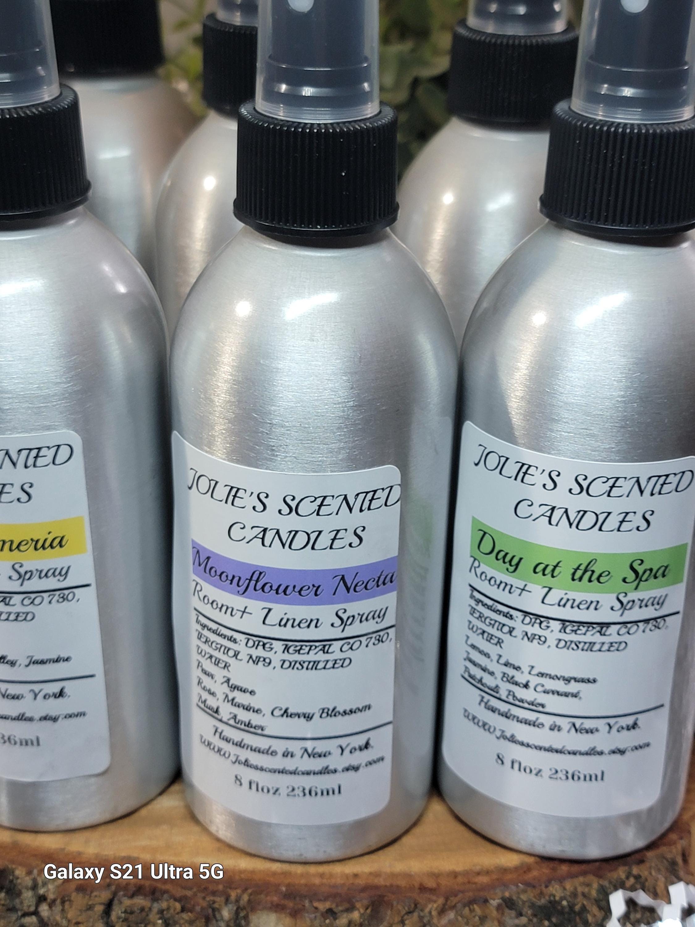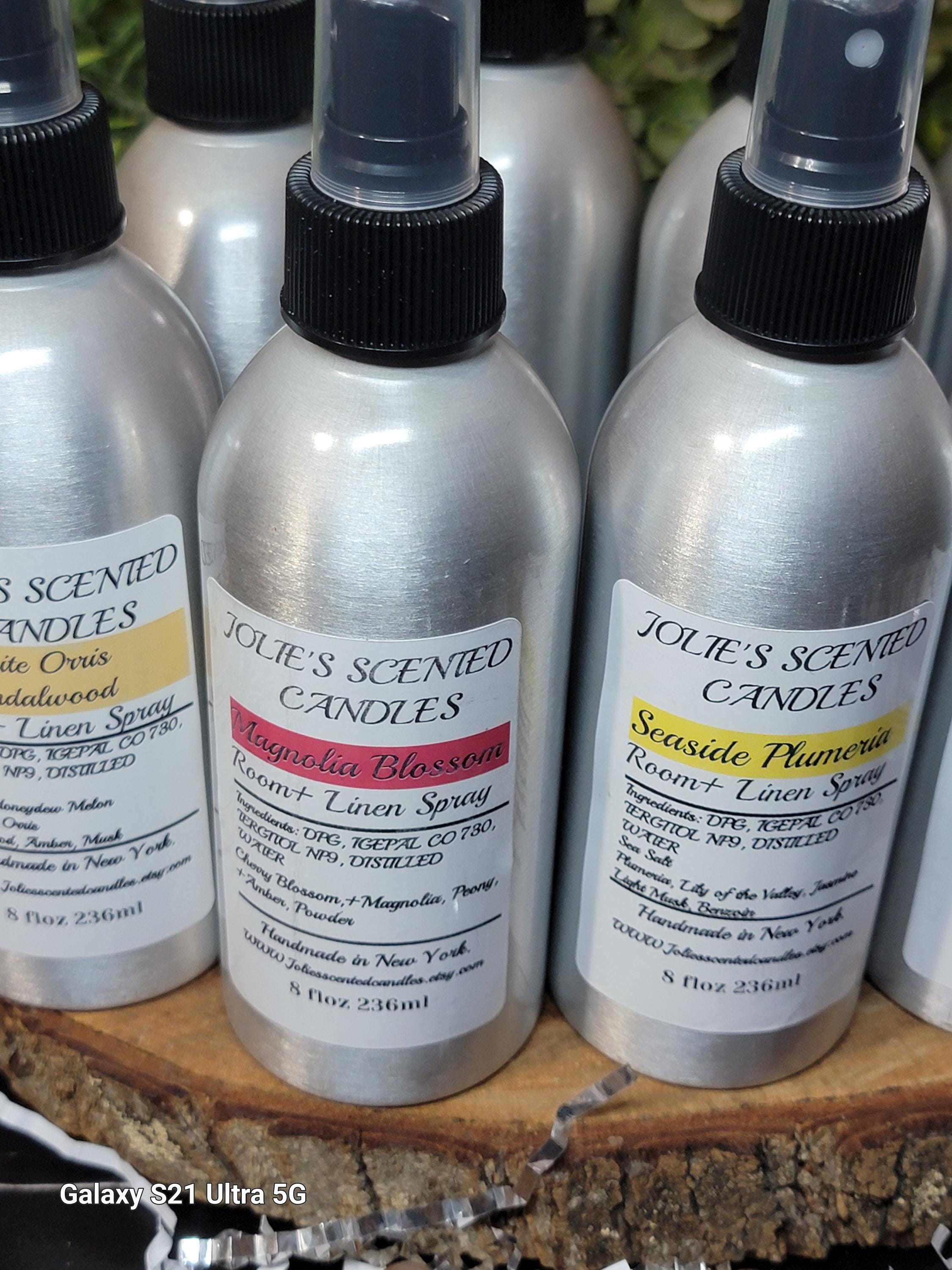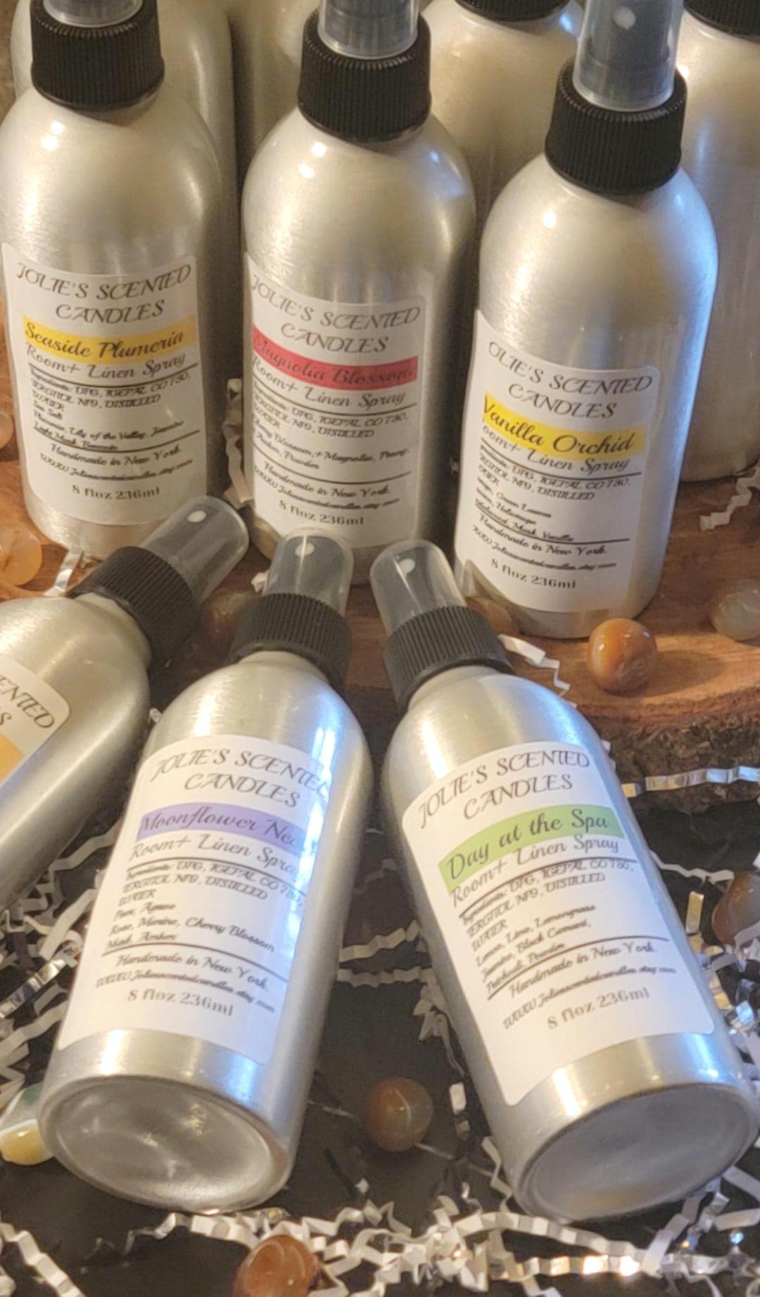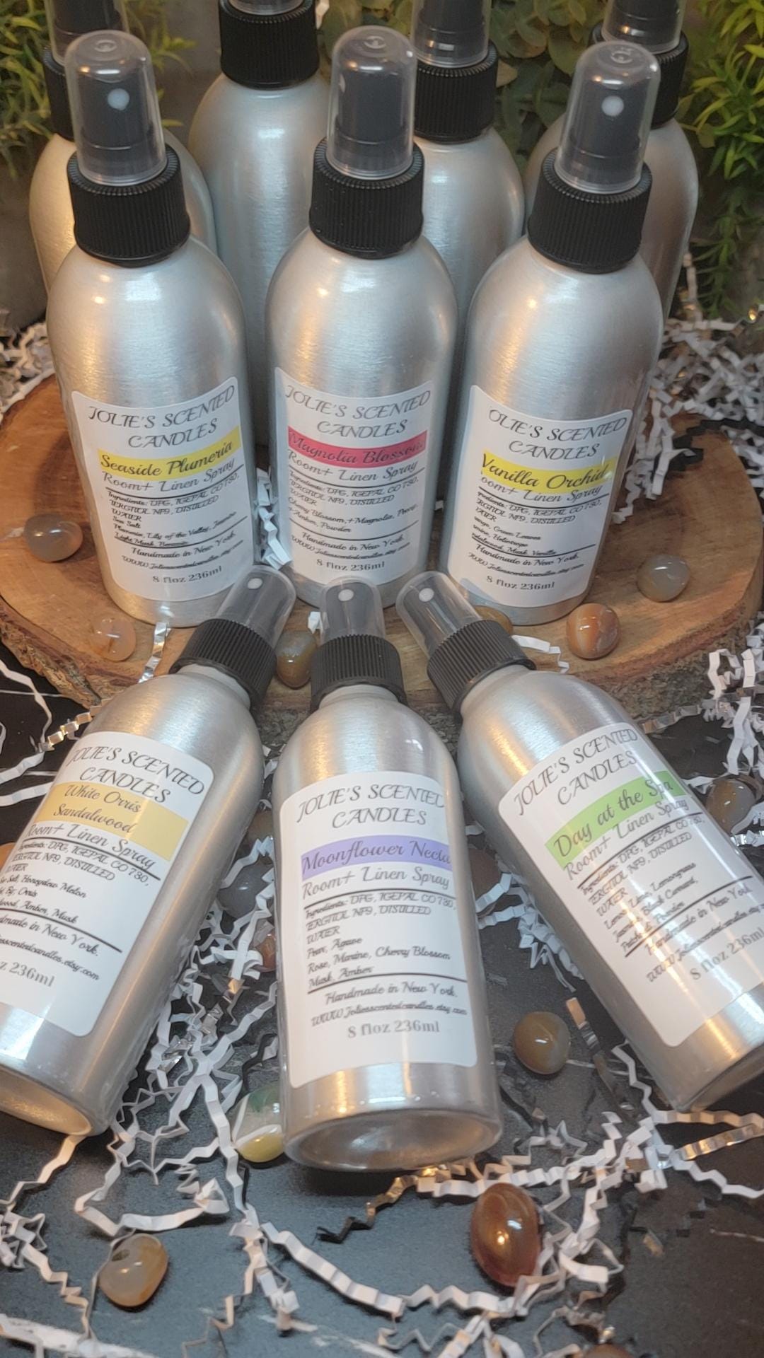Room and linen spray come in an 8 oz Aluminum. jar with a spray top