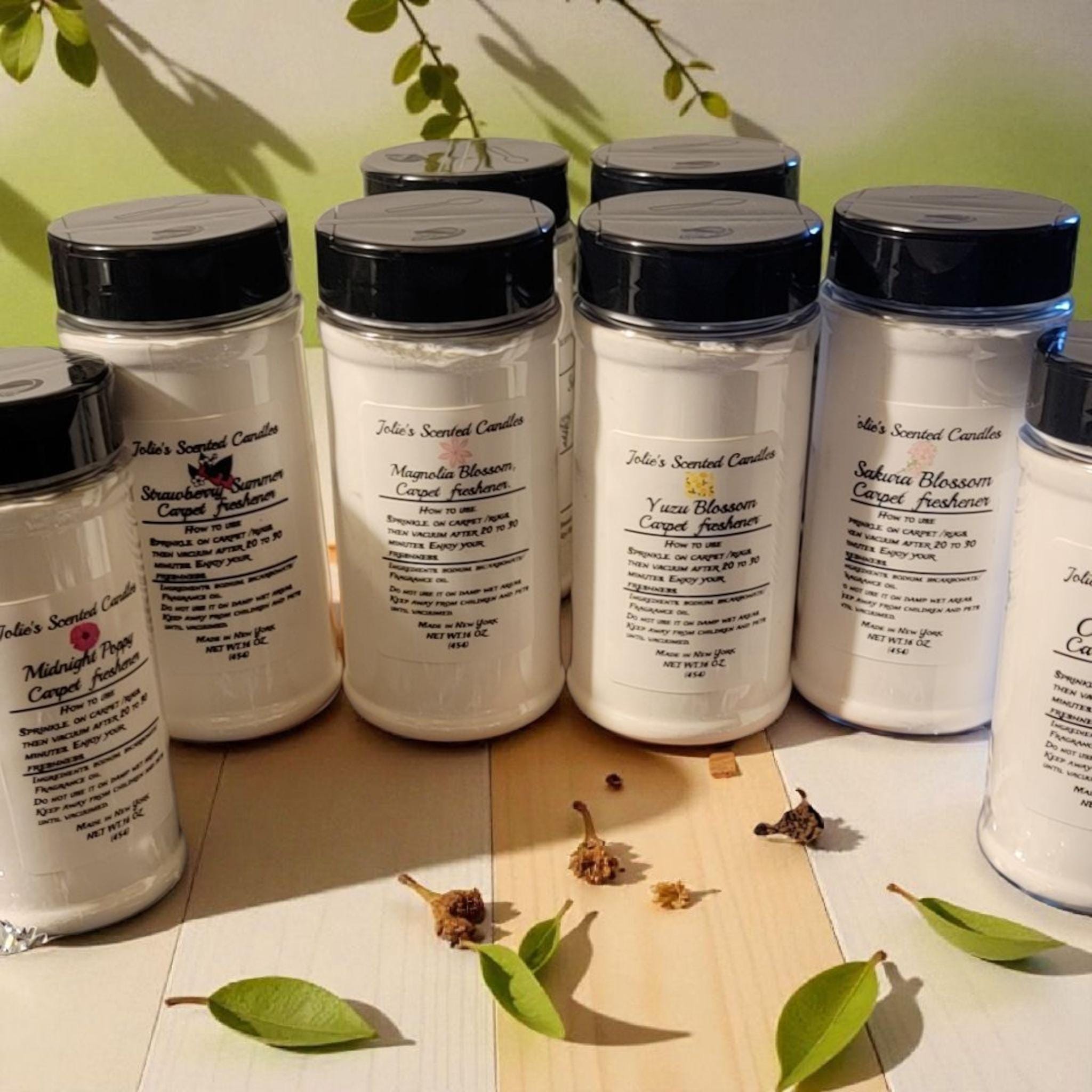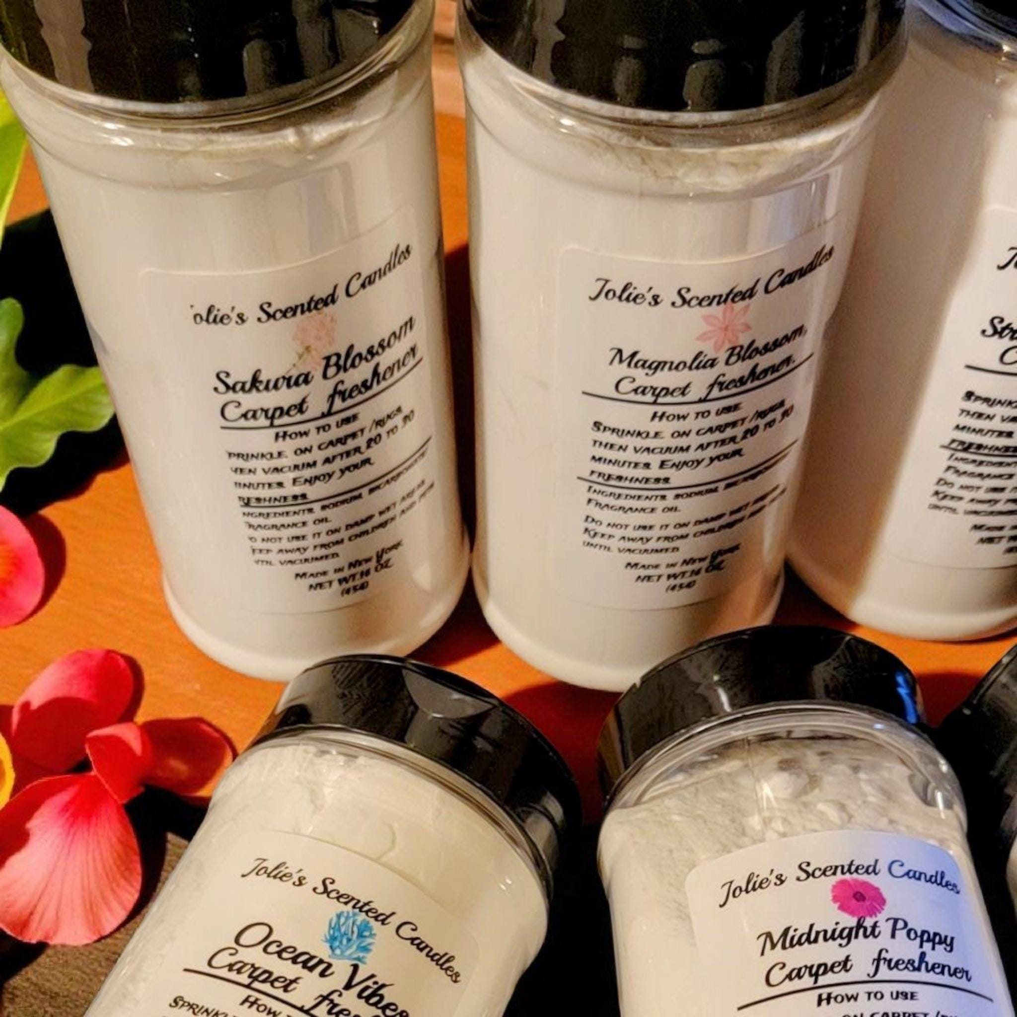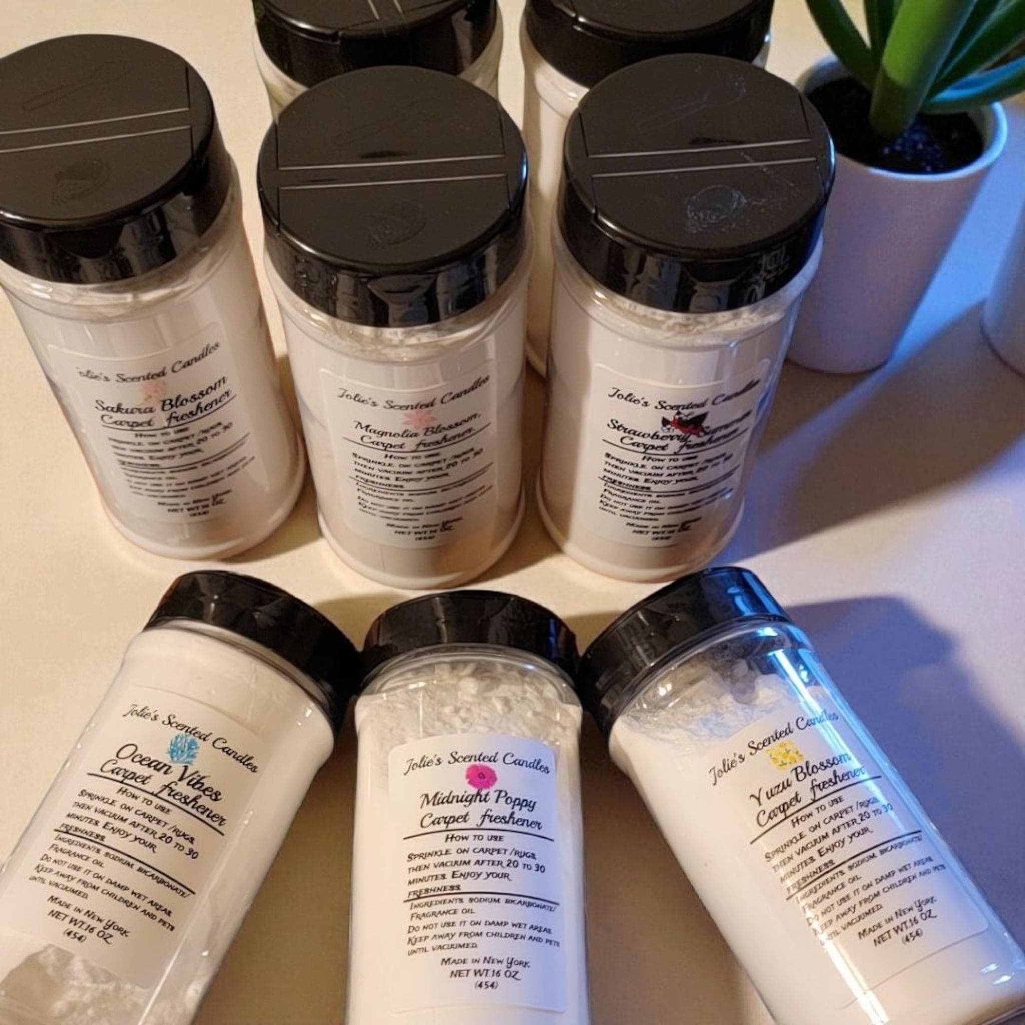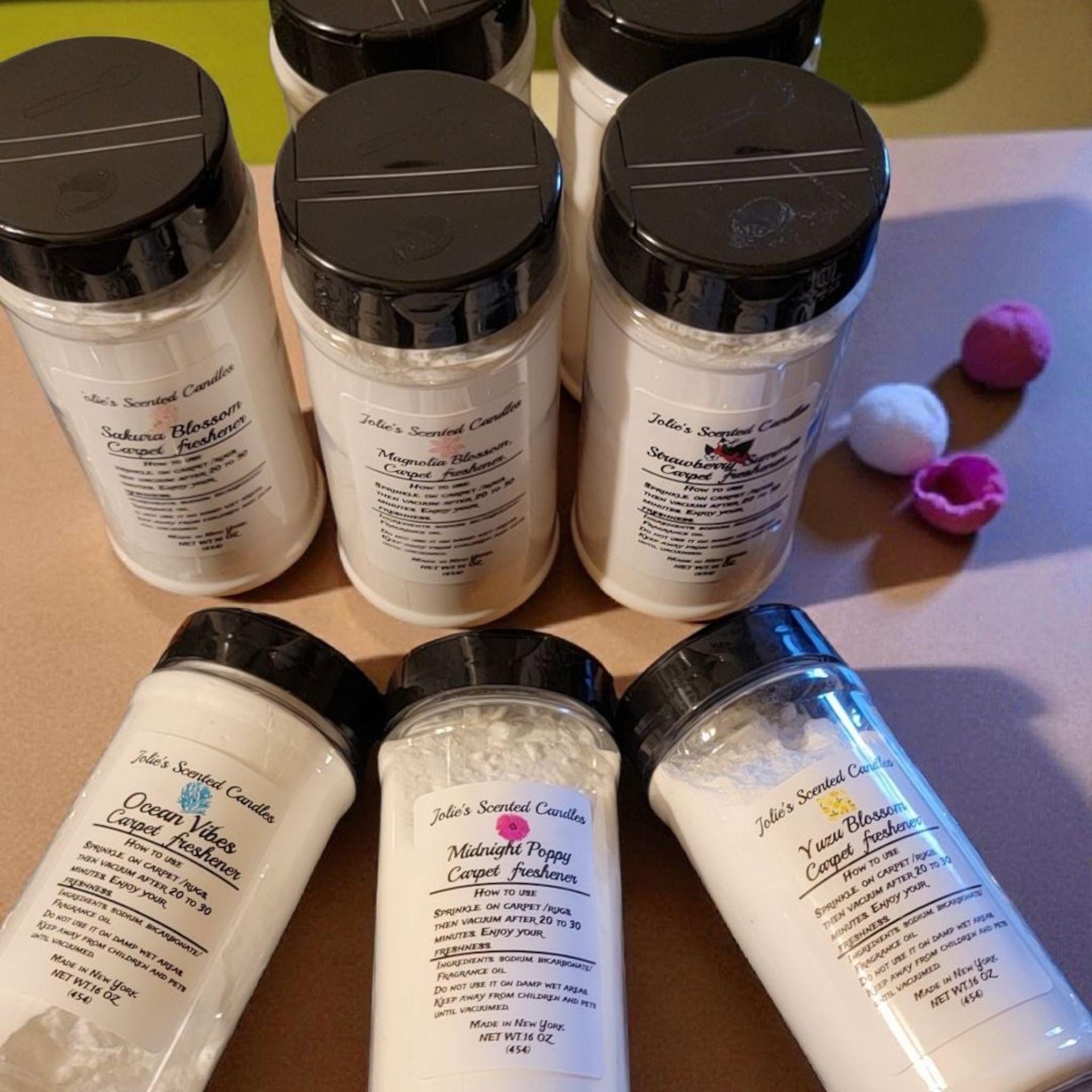 Our 16oz Carpet freshener eliminates deep down odors while freshening your home. Easy to use, individually handmade and hand sifted for best possible results. Just a sprinkle for fresh scent in minutes.