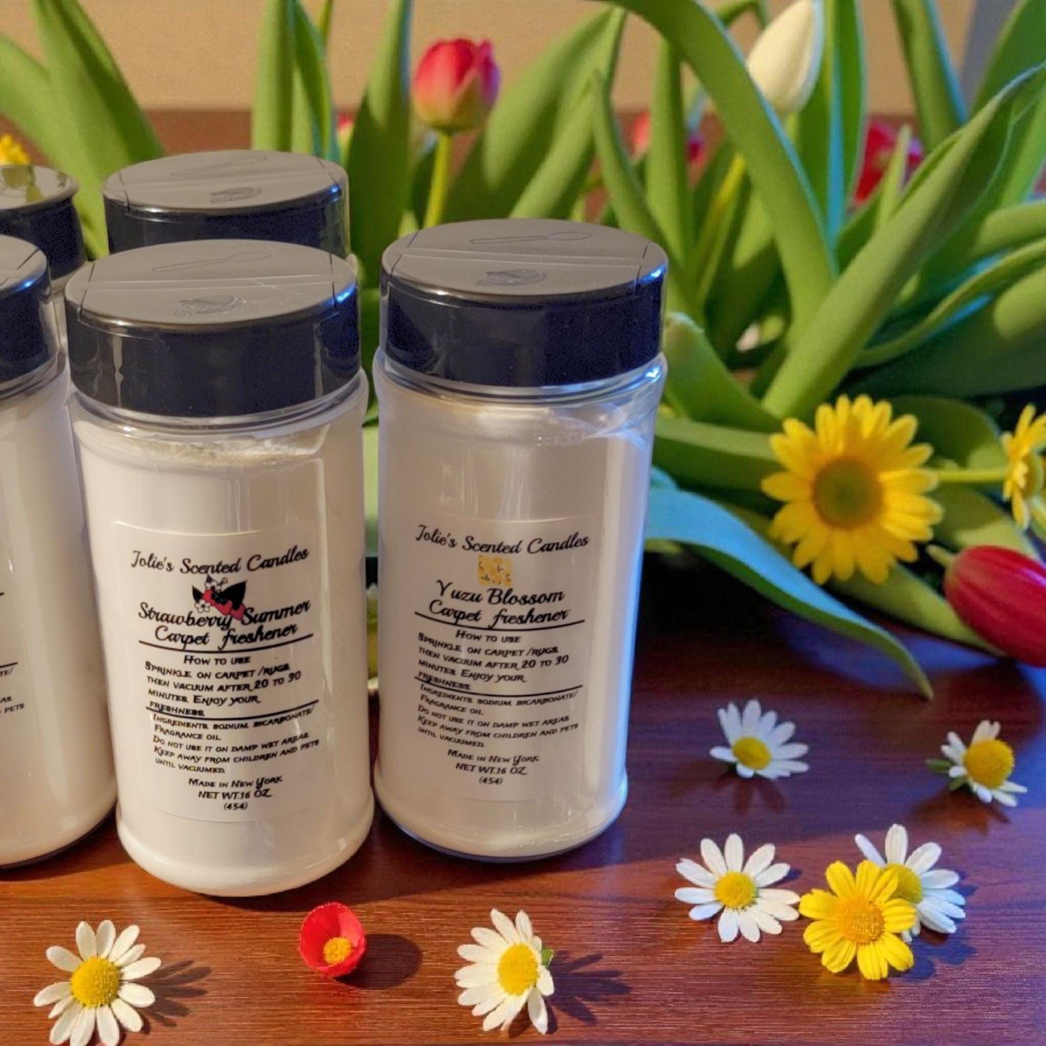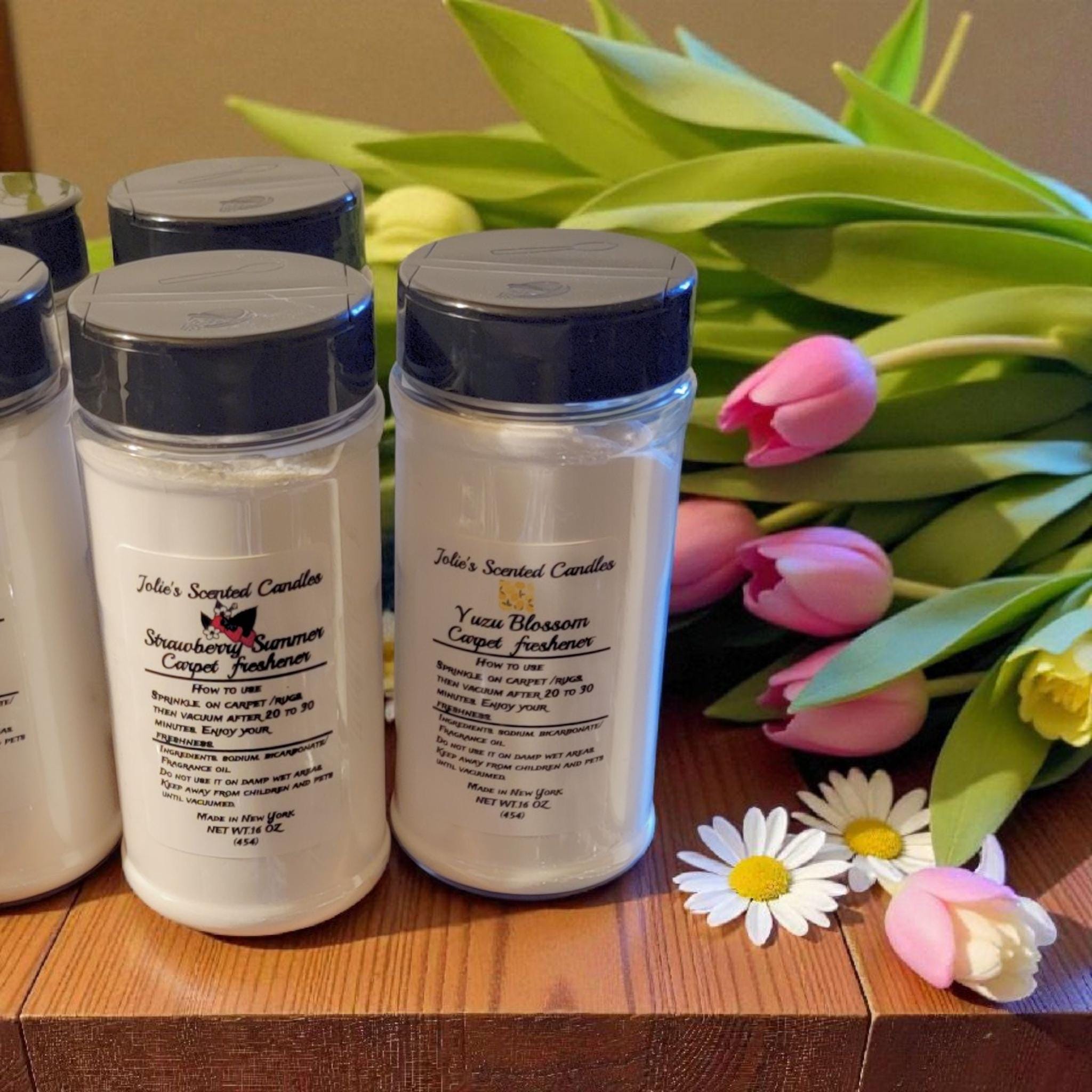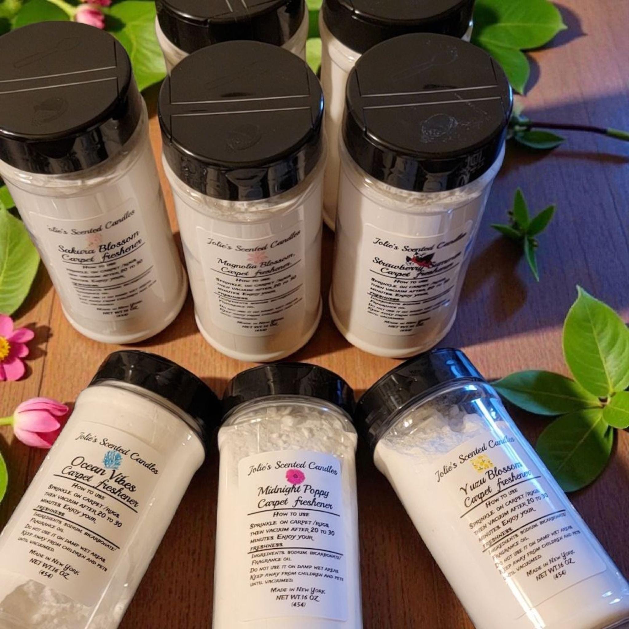 Our 16oz Carpet freshener eliminates deep down odors while freshening your home. Easy to use, individually handmade and hand sifted for best possible results. Just a sprinkle for fresh scent in minutes.