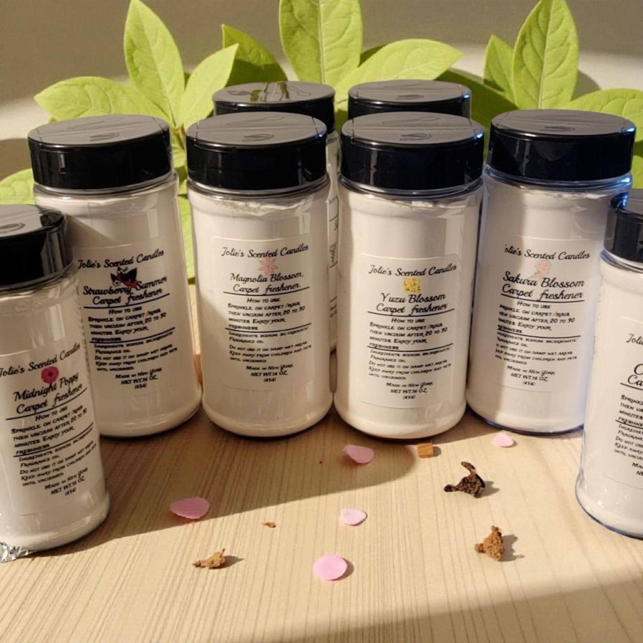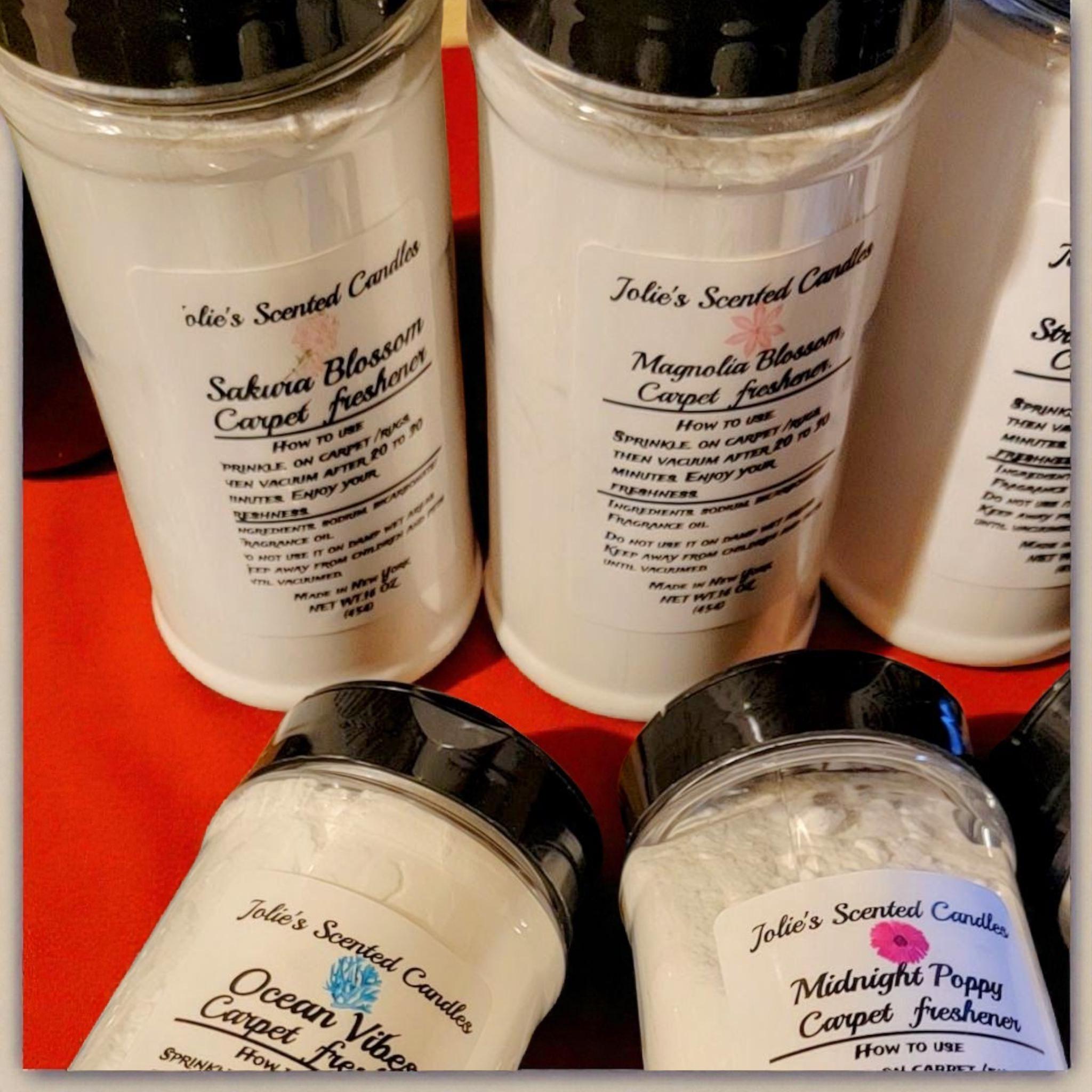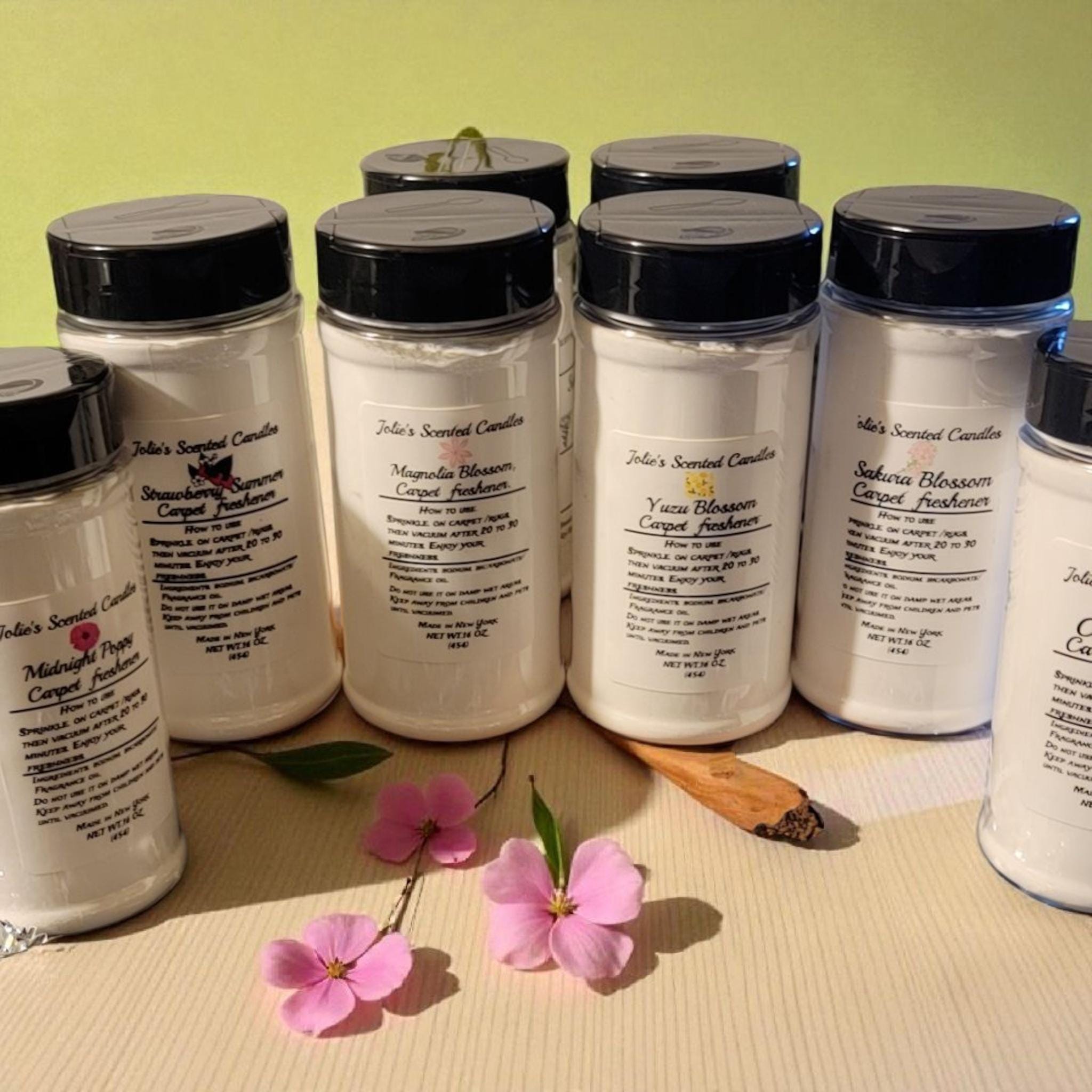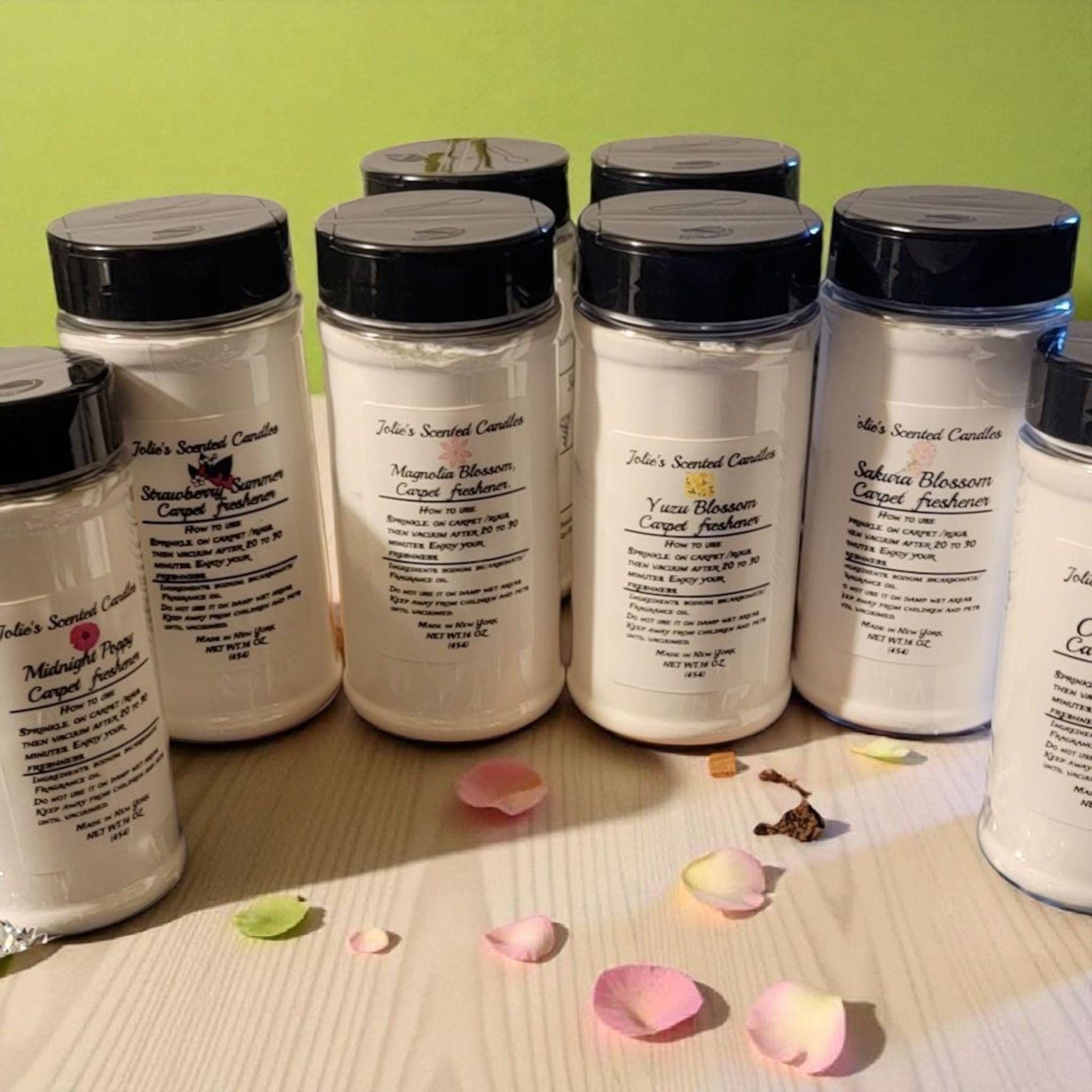 Our 16oz Carpet freshener eliminates deep down odors while freshening your home. Easy to use, individually handmade and hand sifted for best possible results. Just a sprinkle for fresh scent in minutes.